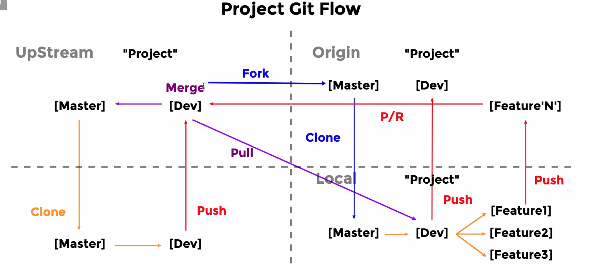 UpStream으로 해당 branch를 올려준다. 이제 팀원들과 함께 작업할 공간이 생겼다!4) Dev fork & $ git clone 'Dev branch 주소' ( 팀원들은 4번부터 시작 )